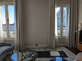 Sometimes a hip problem can work in your favour and result in a silver lining.  Despite studying room photos and booking accordingly, our initial hotel room had much less floor space than anticipated. I was a little panicked as to how I was going to do my necessary sequences to get comfortable following the flight.  My husband mentioned to reception my problem and the next thing we knew, we were being upgraded to a large suite with views of the Grand Canal, with a yoga mat thrown in too.